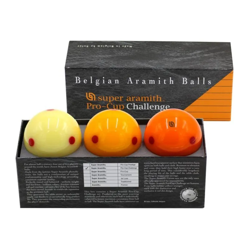 El juego de bolas de billar Super Aramith Pro Cup Challenge está hecho de resina fenólica avanzada, con un centro de gravedad totalmente equilibrado para una capacidad de rodar perfecta. Estas bolas están calibradas de tal manera que se crea un rebote óptimo, para un control óptimo de cada golpe. Las bolas Pro Cup Challenge tienen 6 puntos rojos que facilitan el seguimiento de la rotación de la bola. Las bolas de Aramith son muy resistentes a los impactos y conservan su color, brillo e integridad durante mucho más tiempo que las bolas de poliéster promedio.