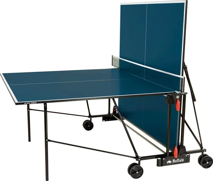 La mesa de ping-pong Buffalo Basic es una mesa de interior sólida con una superficie azul. Es plegable y viene con 4 ruedas dobles, lo que hace que la mesa sea fácil de guardar.