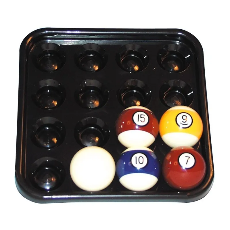 Esta bandeja de plástico moldeado tiene capacidad para 16 bolas de billar. Ideal para guardar y transportar las bolas hacia y desde la mesa.