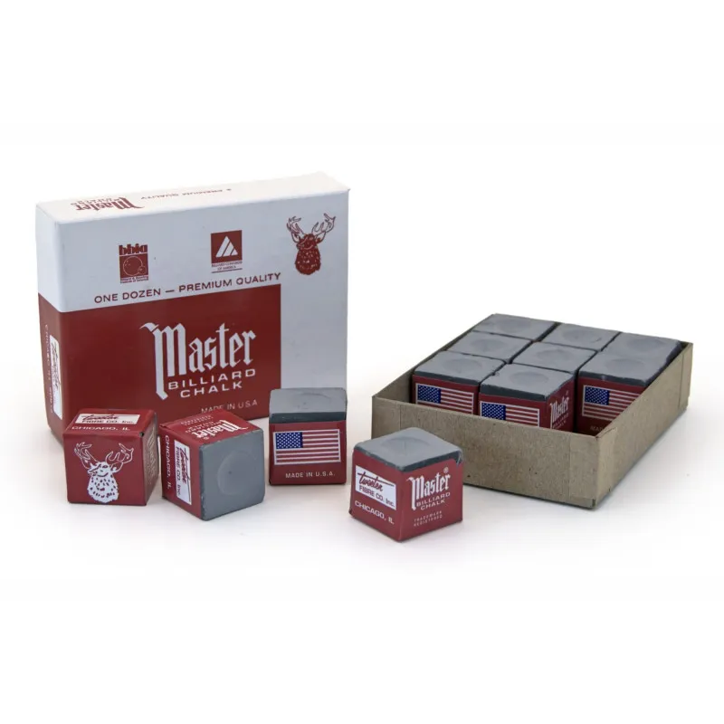 La tiza Master es considerada una de las mejores tizas del mercado; con una textura excepcional que recubre las suelas de los tacos de billar de manera suave y uniforme. Caja de 12 unidades.